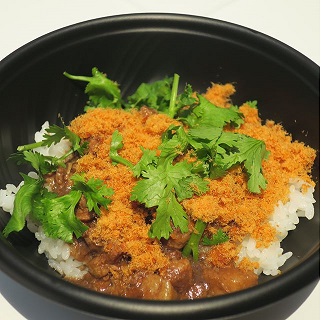 台湾南部味の魯肉飯です良質の豚バラ肉を機械引きでなく丁寧に包丁切りした存在間有るお肉と自社輸入の南部メーカーの香辛料とカジキマグロのデンブを乗せた魯肉飯是非ご賞味ください。