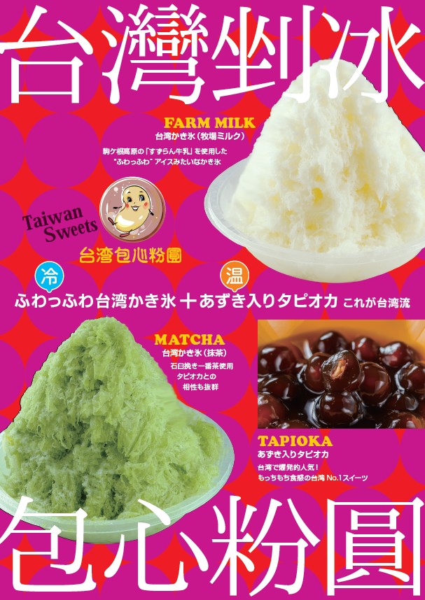 台湾で行列必至の超人気店、宜蘭発祥の魏姐包心粉圓の温かいあずきいり特大タピオカの上に冷たいミルクや抹茶のかき氷を削り、さらに無料で練乳や黒蜜、きな粉などをトッピングできる台湾で人気のニューウエーブかき氷です。
